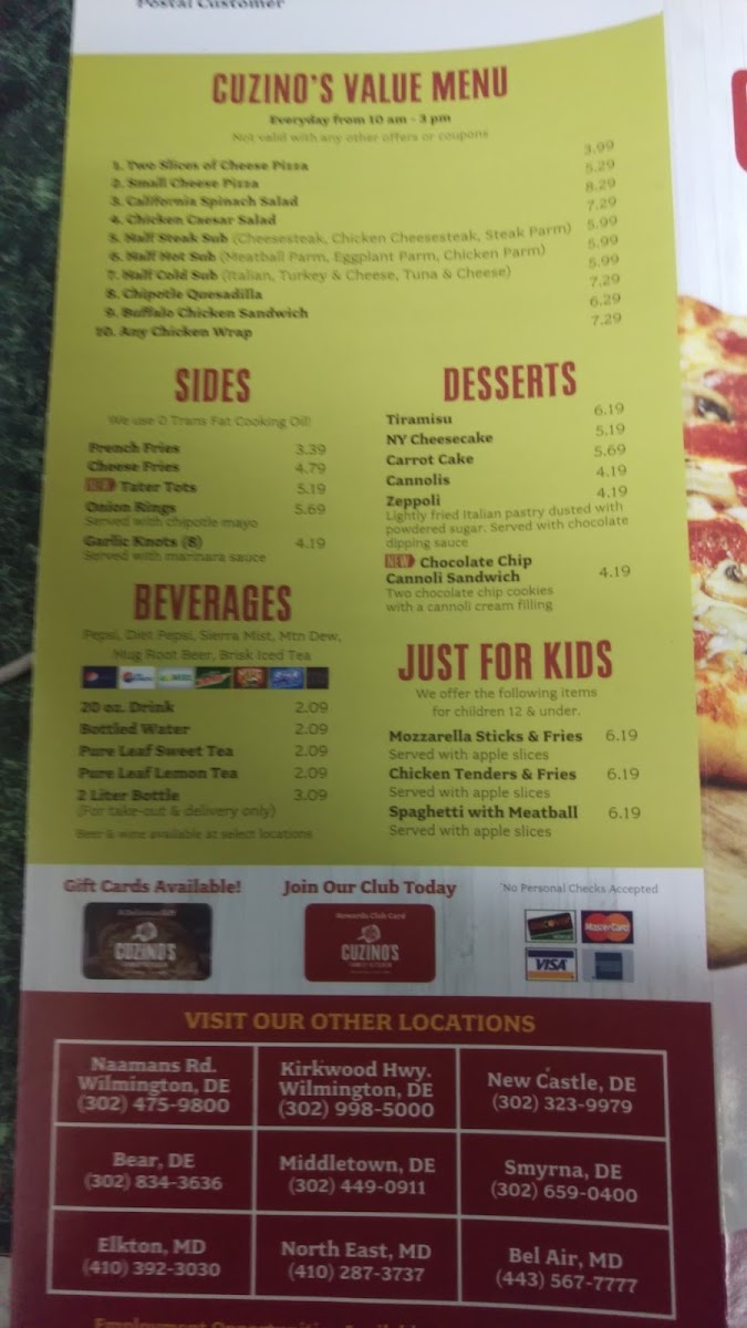 Welcome to the delightful world of Cuzino's Pizza at 464 W Main St, Middletown, DE! This vibrant eatery offers an enticing menu perfect for food lovers of all ages. For the little ones, Kid's Spaghetti with Meatball and Kid's Chicken Tenders make for delightful meals at just $8.19 each.